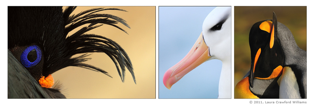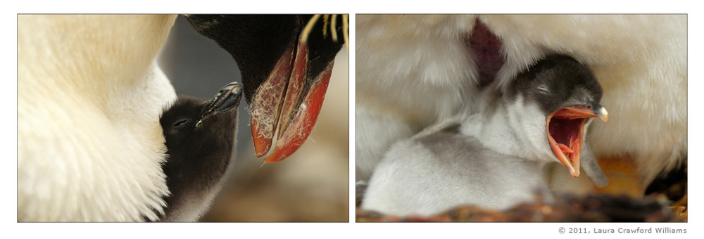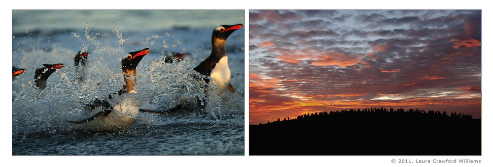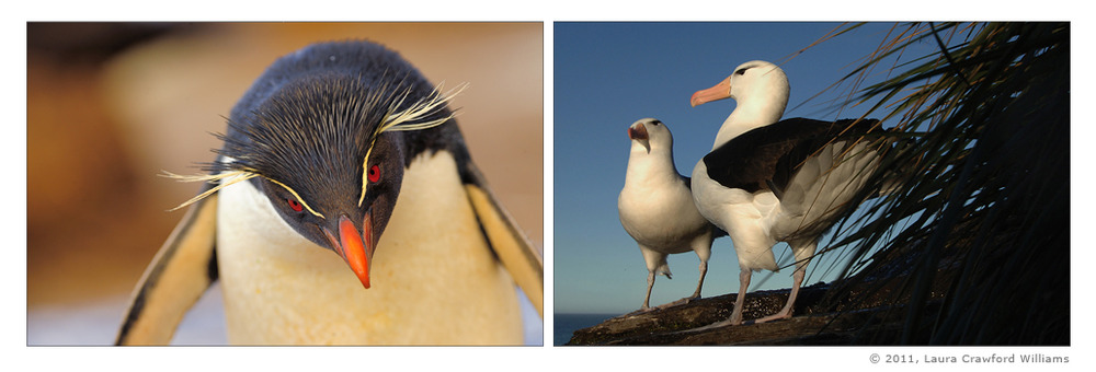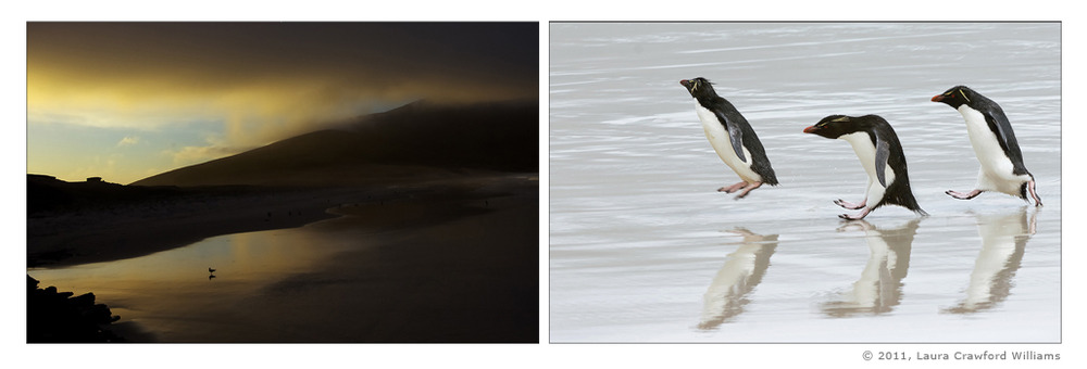 One of my favorite locations is on Saunders Island at a place called the Rookery. There’s a large Rockhopper Penguin colony that stretches high upon the hill. Near the colony is a fresh water spring. All day long, the Rockhoppers walk, run, or hop to the spring, hunched over like little old men with big pink feet. The nails at the end of each toe allow them to climb up steep rocks in order to come to an area where fresh water drips like a waterfall. It’s known as the ‘penguin shower’ and is a must see location if you ever visit. Penguins stand in line as they wait for their turn in the shower. If a penguin takes too long cleaning up, waiting penguins gang up upon them and they are chased away so that others may take their turn. We witness very human behavior in a similarly human situation.